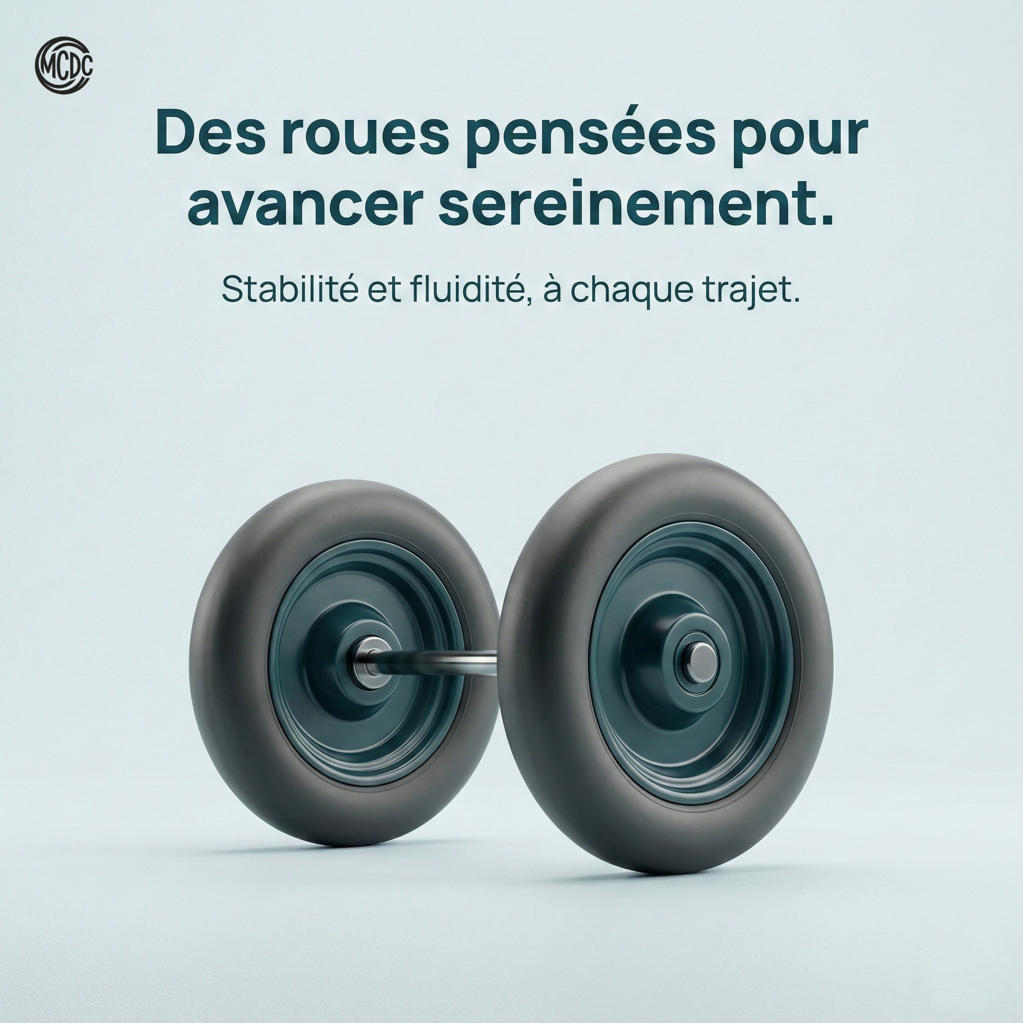 Les roues sont conçues pour un usage régulier en ville (trottoirs, marchés, sols irréguliers), avec une attention particulière portée à la stabilité et au confort de roulage.