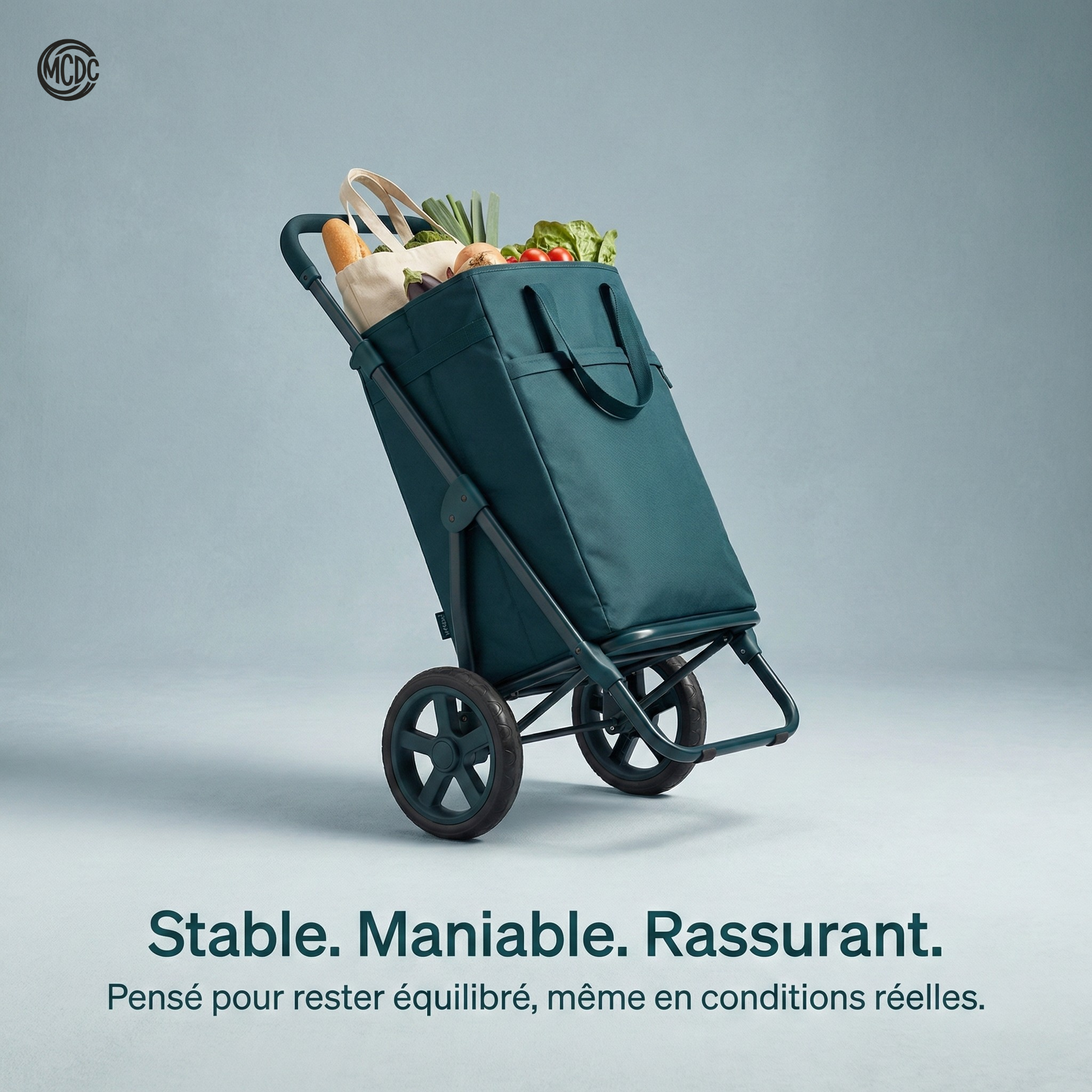 Un bon chariot de course doit rester maniable et équilibré, même lorsqu’il est chargé. La conception privilégie une bonne tenue au sol et une trajectoire fluide, afin de se déplacer sereinement sur trottoirs, allées de magasin ou sols irréguliers.